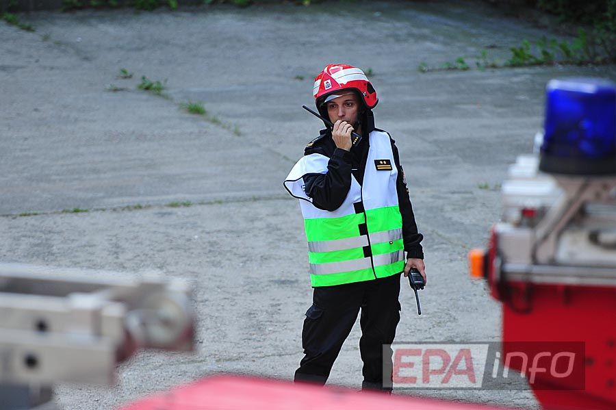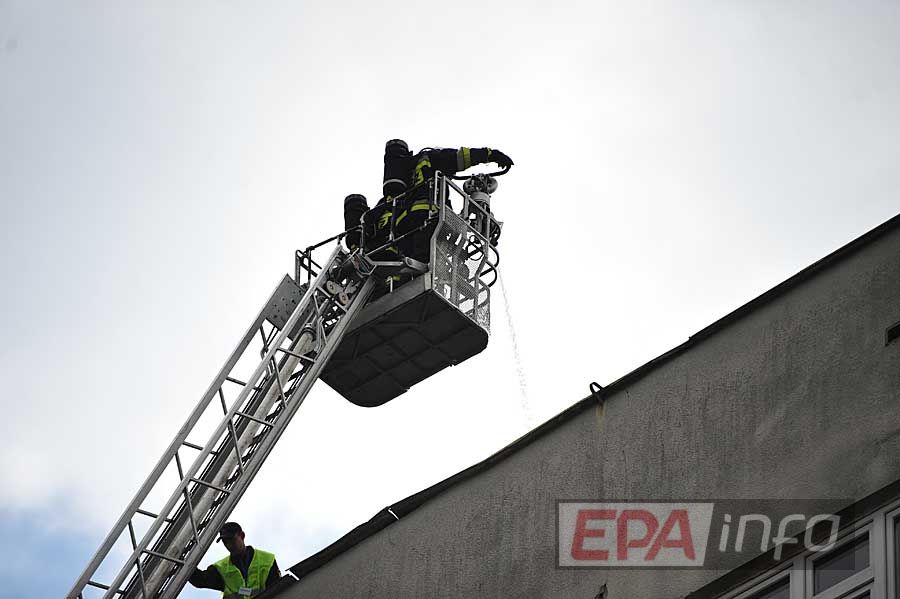 Strażacy działający w aparatach powietrznych rozpoznali źródło ognia. Pożar powstał w znajdującej się na VII piętrze (IX kondygnacja) maszynowni dźwigu, wskutek zatarcia się mechanizmu windy i przystąpiono do gaszenia. Do akcji wkracza specjalistyczny pojazd „tzw. drabina. Strażacy wyniesieni w koszu na wysokość dachu budynku gaszą pożar.