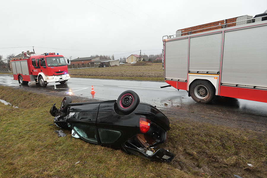 Do wypadku doszło na wysokości przystanku PKS, około godz. 16.00. Z relacji zgłaszającego wynikało, że osoby nie wymagają pomocy medycznej i same opuściły pojazd. Najprawdopodobniej kobieta kierująca Twingo wyjeżdżając z posesji wymusiła pierwszeństwo na kierowcy Civica. Po przyjeździe strażaków na miejsce okazało się, że poszkodowane są 3 osoby. 24-letni kierujący Hondą Jarosław K. uskarżał się na ból brzucha. Strażacy z OSP Dłutów unieruchomili odcinek szyjny kręgosłupa oraz podali poszkodowanemu tlen. Mężczyzna został przewieziony do pabianickiego szpitala.