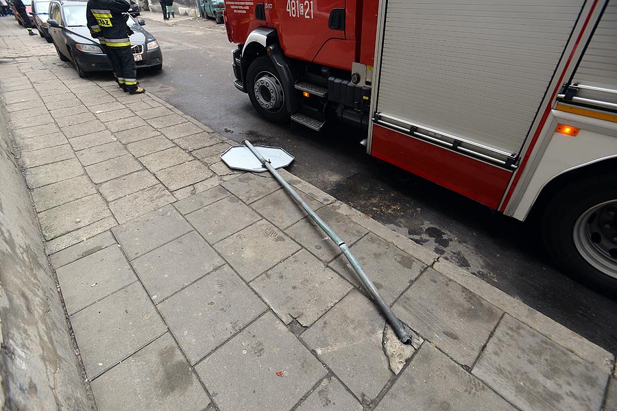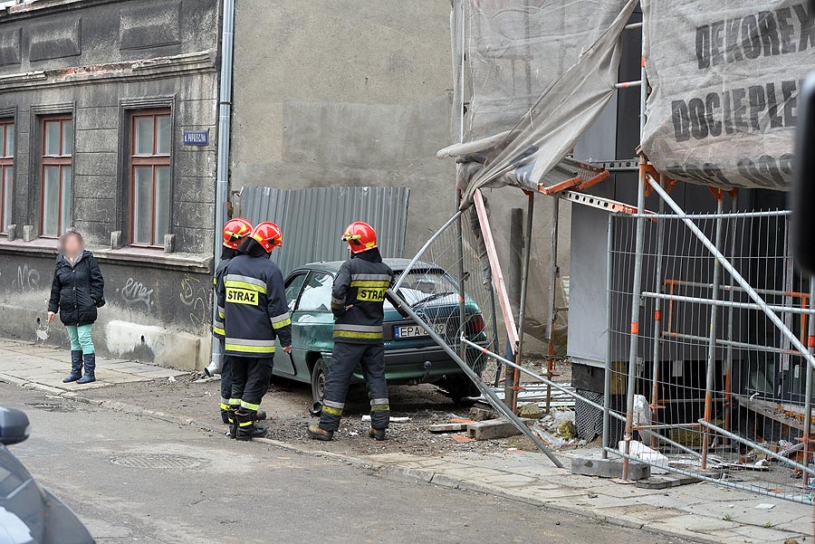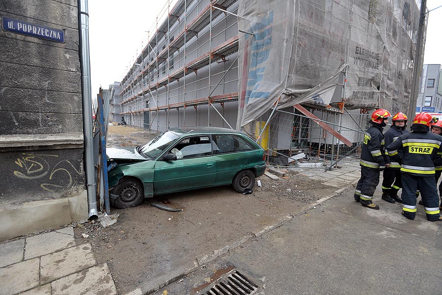 Astra kierowana przez 17-latka z ul. Bòźnicznej wjechała na chodnik, ścięła znak „stop” po lewej stronie. Auto zjechało na drugą stronę ulicy i uderzyło w rusztowanie.