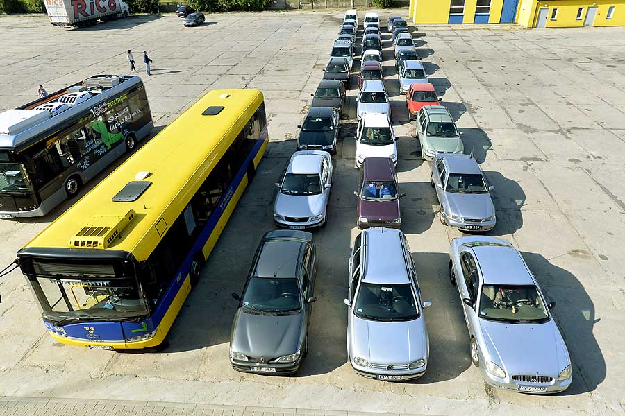 Na placu manewrowym stanął autobus marki Solaris, który ma 33 miejsca siedzące. Według obliczeń urzędników średnio w jednym autobusie miejskim podróżuje 42 pasażerów. Natomiast statystyki ogólnopolskie podają, że jednym autem podróżuje średnio 1,4 osoby. Dlatego dla porównania obok autobusu ustawiono 30 samochodów osobowych.