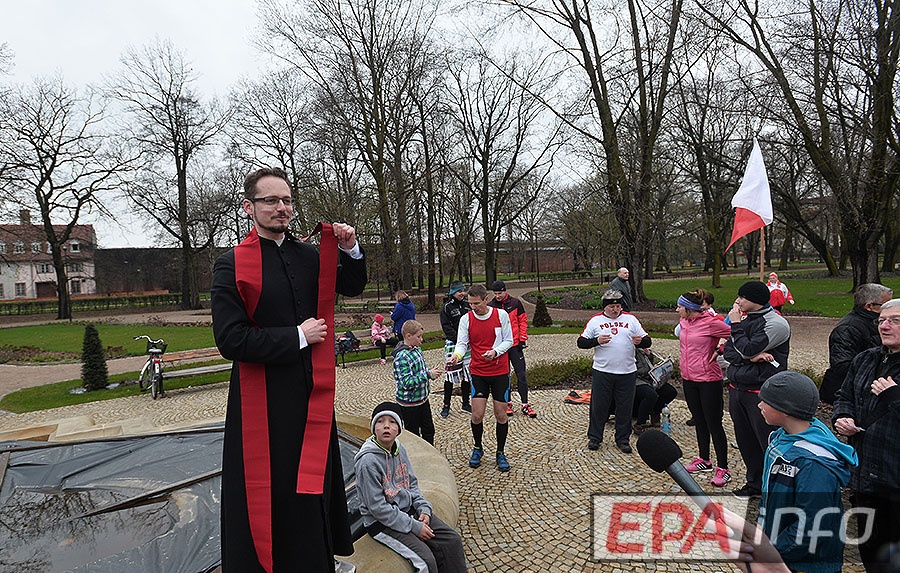 Nietypową akcję zorganizował Robert Lewera, podróżnik i biegacz. Do działań włączył się ksiądz Michał Misiak z pobliskiej parafii św. Mateusza, który odnowił chrzest. Później wszyscy odśpiewali Bogurodzicę i pobiegli dalej. Wcześniej o wydarzeniach sprzed 1050 lat opowiadał Maciej Nowosławski z Łodzi.