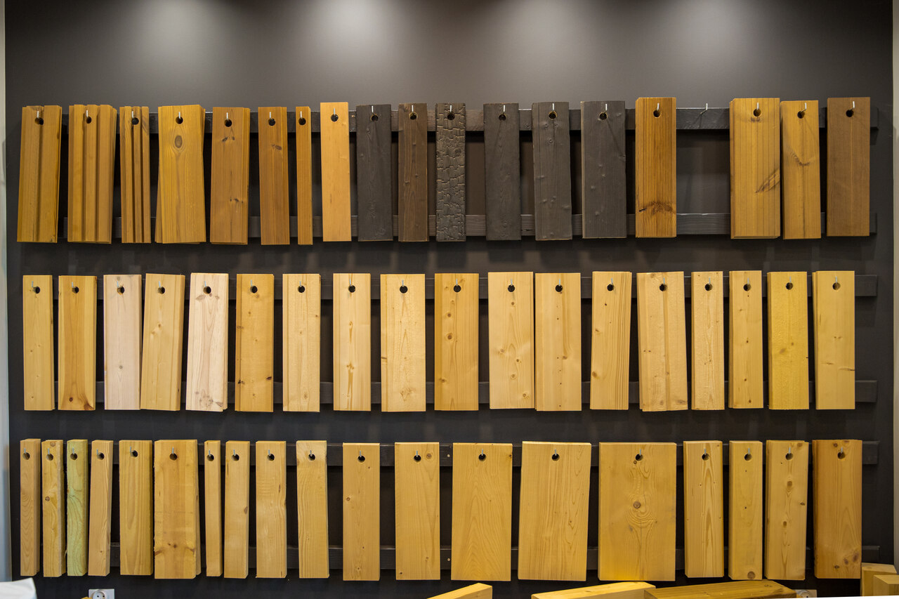 ● Termo drewno sosnowe – poddane specjalnej obróbce termicznej, która redukuje chłonność wilgoci i ogranicza ryzyko deformacji. Dzięki temu deski doskonale sprawdzają się jako materiał na tarasy i elewacje. Co ważne, nie wymagają dodatkowej impregnacji – z biegiem czasu „starzeją się” naturalnie, zmieniając kolor w estetyczny, szlachetny sposób. Efekt ten można zobaczyć na ekspozycji w punkcie sprzedaży.