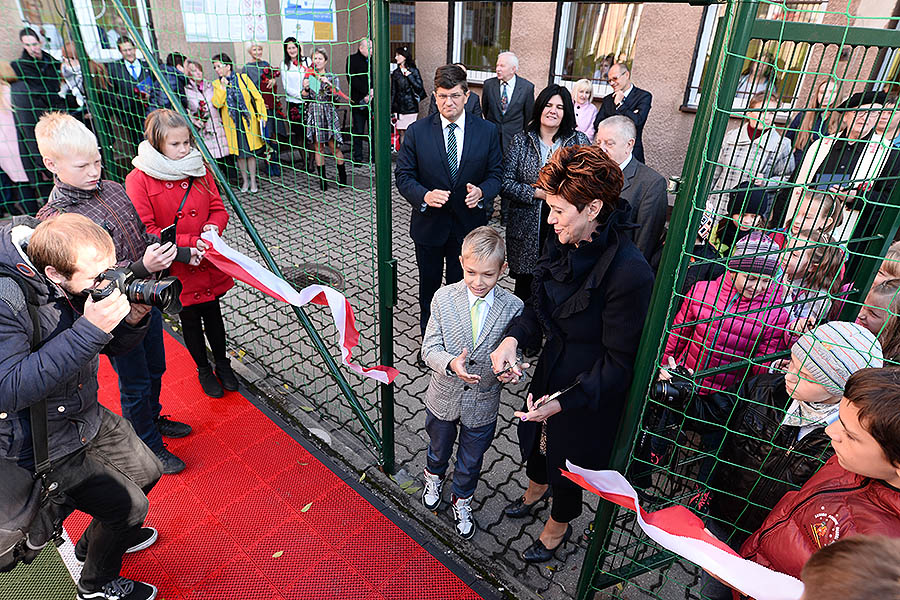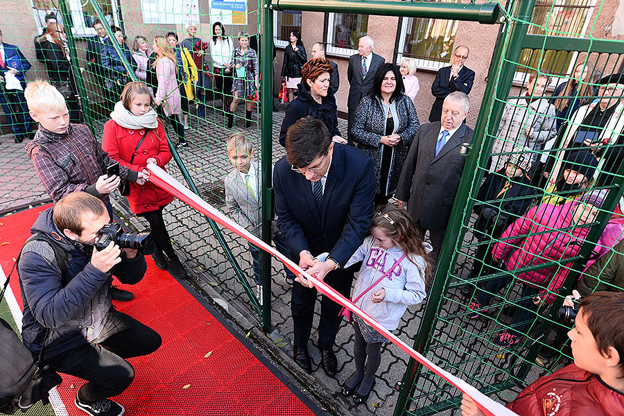 Prezydent miasta, dyrektor placówki oraz uczniowie przecięli wstęgę podczas oficjalnego otwarcia boiska przy Szkole Podstawowej nr 8.