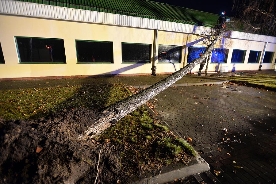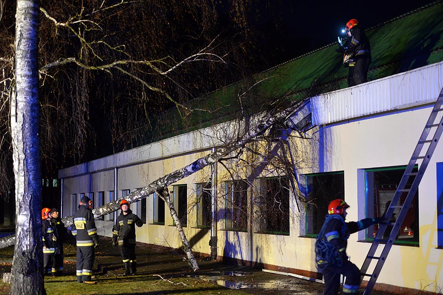 Wiatr wyrwał z korzeniami jedną z brzóz rosnących po południowej stronie hali przy ul. Grota Roweckiego. Drzewo spadło na budynek. Na miejsce zdarzenia przyjechali strażacy, którzy przy pomocy pił spalinowych usunęli powalone drzewo. Kierownik hali wstępnie oszacował straty na około 10 tys. złotych.