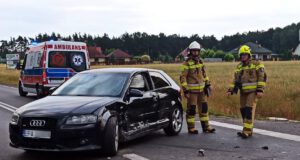 Golf roztrzaskany na drzewie. Droga wojewódzka zablokowana