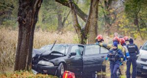 Deszcz i śliska jezdnia. Kobieta kierująca BMW rozbiła auto na drzewie