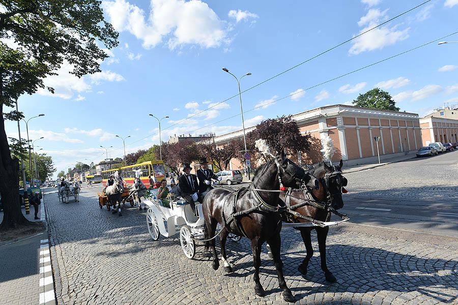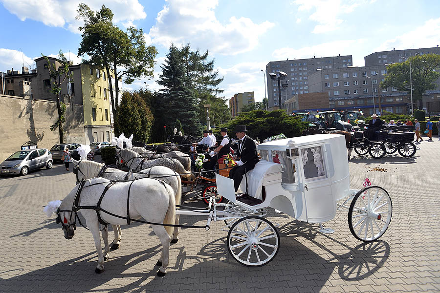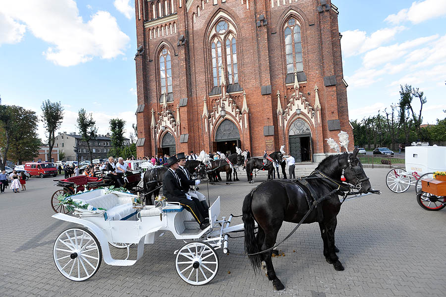 Pan młody to współwłaściciel znanej firmy wynajmującej karety, dlatego na ślub pary z Szynkielewa przyjechali zaprzyjaźnieni stangreci z całej Polski. Młodzi przed kościół Najświętszej Marii Panny zostali przywiezieni przez powóz zaprzężony w dwie pary koni. Przez ulice Zamkową przejechało 9 zaprzęgów i … 3 potężne traktory.