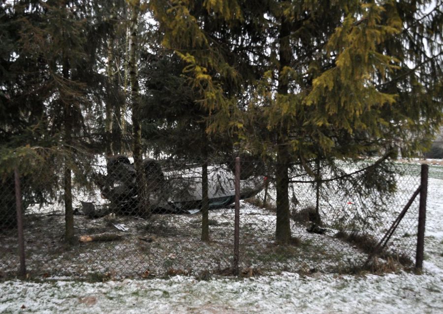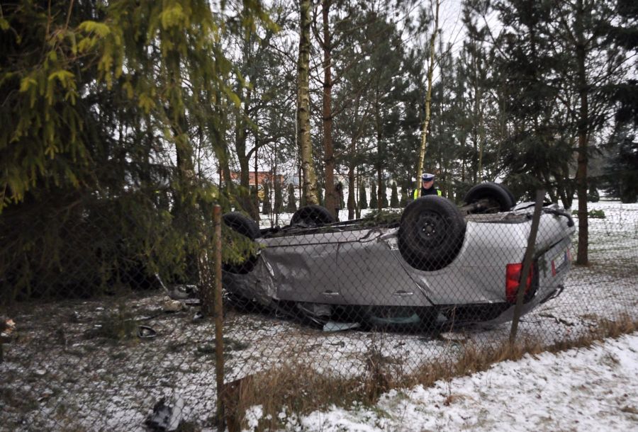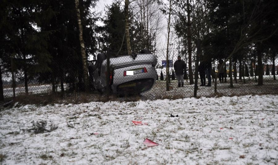 Około 12.30 jadący z Bud Dłutowskich w kierunku Huty Dłutowskiej samochód Nissan Primera na bełchatowskiej rejestracji zjechał na przeciwległy pas ruchu, skosił przydrożny znak i „wybił się” od betonowego zakończenia rowu na tyle silnie, że dachował na znajdującej się kawałek dalej posesji domu. Samochód „przeleciał” przez siatkę ogradzającą teren wyrywając słupki mocujące i przewracając kilka drzew. Miał jednak sporo szczęścia, bo zatrzymał się idealnie między dwoma dość solidnymi brzozami.