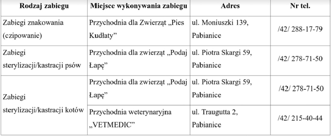 Wszyscy zainteresowani mogą wraz ze swoim pupilem przyjść do niżej podanych przychodni. Z uwagi na to, że akcja przeznaczona jest wyłącznie dla właścicieli zwierząt z terenu Pabianic, w przychodni należy okazać dowód osobisty potwierdzający miejsce zamieszkania. Ilość zabiegów jest ograniczona.