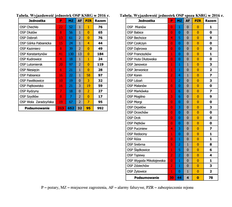 Wśród poszczególnych jednostek najczęściej wzywani byli strażacy z Konstantynowa Łódzkiego. Zanotowali 184 wyjazdy. Imponująco wyglądają też statystyki poszczególnych członków OSP z tej jednostki. 131 razy do akcji stawiał się druh Henryk Kern, a 113 wyjazdów ma na koncie Jakub Michalczyk.