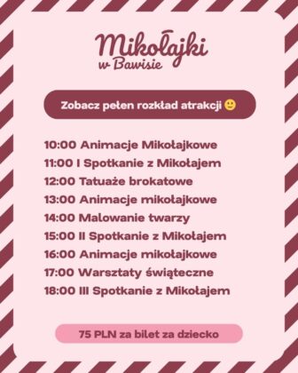 Tego dnia Bawisie świętują przez cały dzień. Już od 10.00, co godzinę, rozpoczynać będą się nowe mikołajkowe atrakcje. To m.in. brokatowe tatuaże i makijaże w stylu Christmas, animacje, a także świąteczne warsztaty dostosowane do wieku małych uczestników.