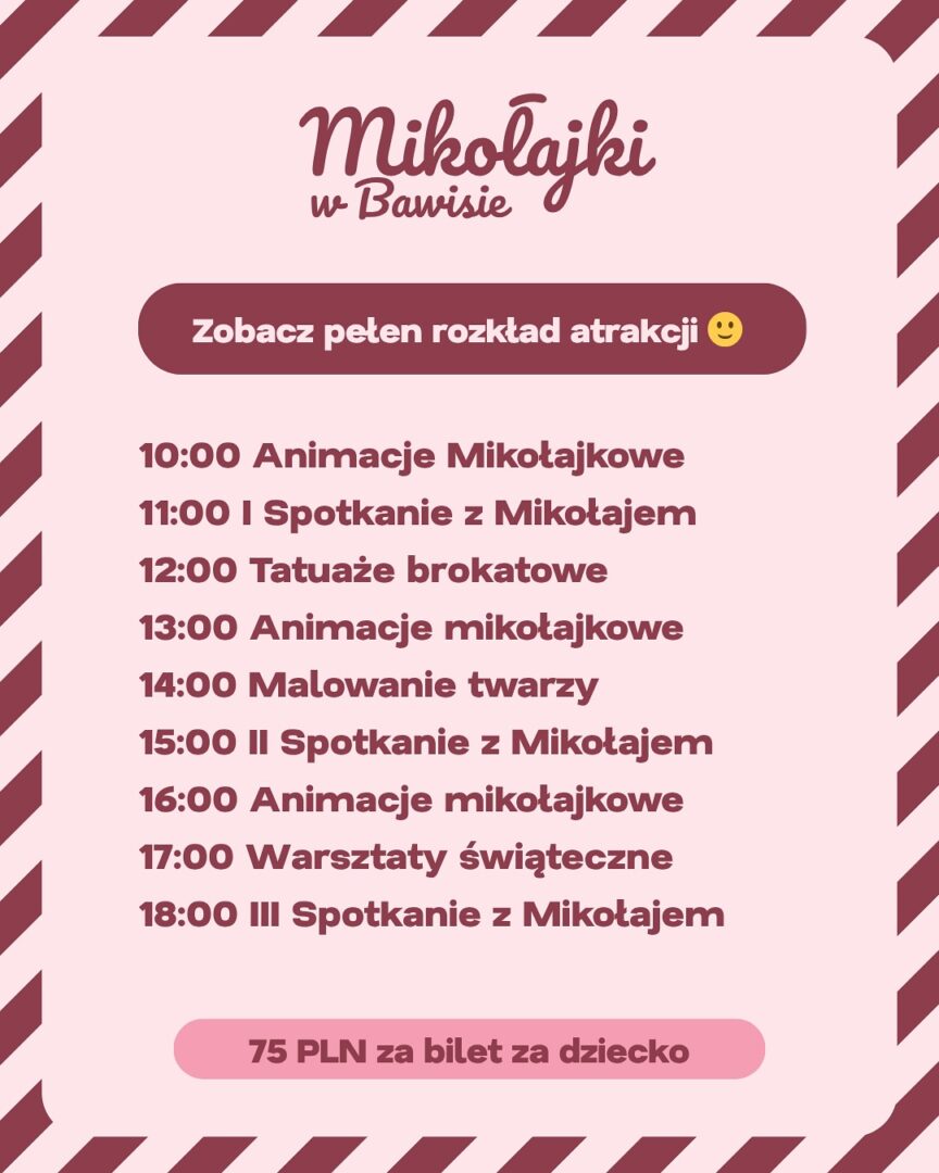 Ale co najważniejsze… tego dnia w Bawisiach zawita Święty Mikołaj i to aż 3 razy! Odwiedziny Gwiazdora zaplanowano na godz. 11.00, 15.00 i 18.00.