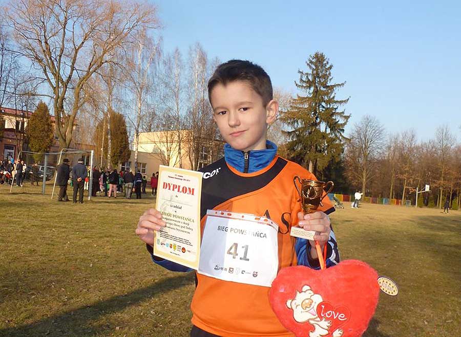Uczeń IV klasy Szkoły Podstawowej nr 13 jest pływakiem, ale w biegach wyrabia kondycję. W lutym 2014 brał udział w II Biegu Powstańca w Dobrej. W kategorii dzieci i młodzieży na dystansie 100-800 metrów zajął 3. miejsce. W marcu wystartował w IV Pabianickim Półmaratoniku ZHP. W swojej kategorii wiekowej zajął 2. miejsce na dystansie 400 m.