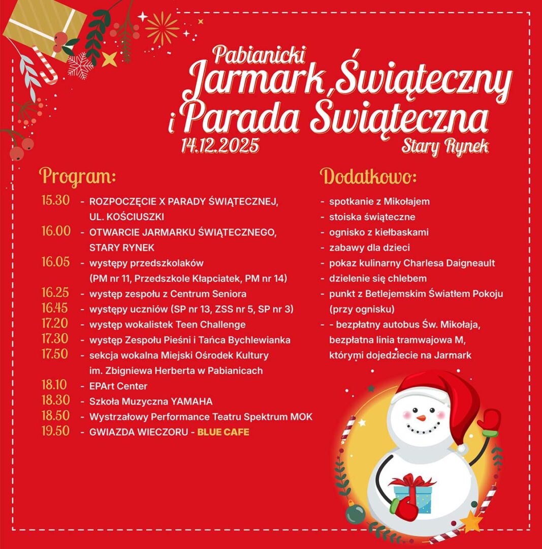 W przyszłą niedzielę, 14 grudnia, odbędzie się Jarmark Świąteczny. Oprócz skorzystania z atrakcji na Starym Rynku, uczestnicy wydarzenia będą mogli wziąć udział w X Pabianickiej Paradzie Świątecznej. Współorganizatorem ponownie jest firma Jumi.