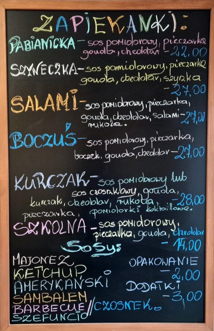 W Zapiekance Pabianickiej do wyboru mamy pięć rodzajów tego dania: klasyczną „Pabianicką” z sosem pomidorowym, farszem z pieczarek i dwoma rodzajami sera: goudą i cheddarem, „Szyneczkę, „Salami” z dodatkiem aromatycznej rukoli, „Boczusia”, który podczas pieczenia nabiera przyjemnej chrupkości i „Kurczaka”, czyli soczyste kawałki mięsa zapiekane (jak każda z pozycji w menu) w goudzie i cheddarze, z farszem pieczarkowym, koktajlowymi pomidorkami i dwoma rodzajami sosów.