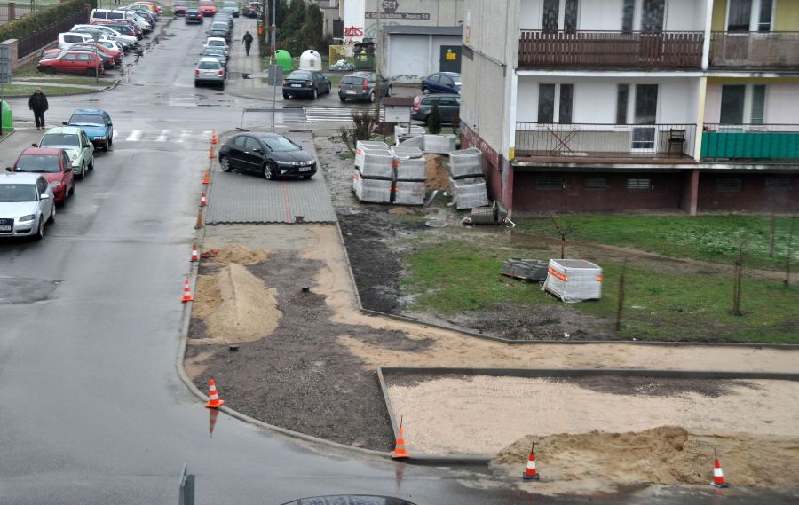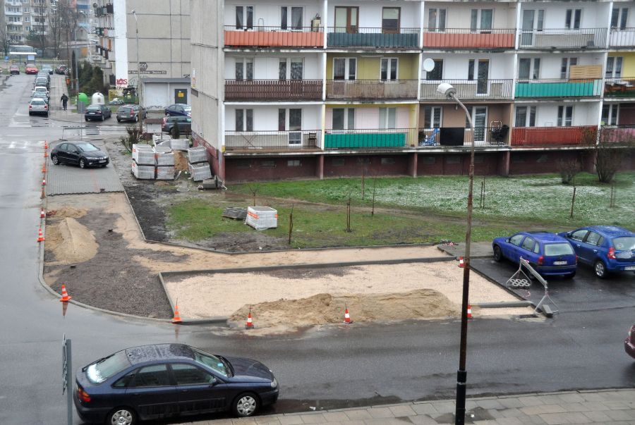 Docelowo będą tutaj miejsca do parkowania oraz wydzielona część dla pieszych. Do tej pory był tu wąski chodnik i pas zieleni, które mieszkańcy przerobili na „dziki parking”. Spółdzielnia postanowiła więc wyjść im naprzeciw i stworzyć warunki do „legalnego” parkowania.