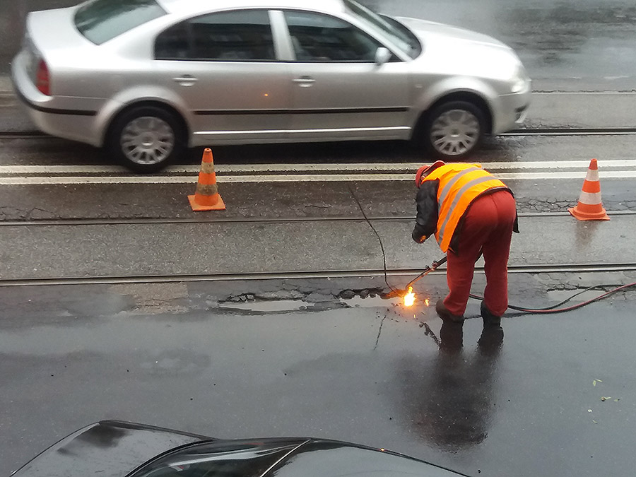 W ostatnim tygodniu października ekipa techniczna Miejskiego Przedsiębiorstwa Komunikacyjnego w Łodzi działała na ul. Warszawskiej. Tam z jezdni wystawał stalowy pręt. Pracownicy wycięli żelastwo i przy okazji załatali dziurę w jedni. Technika łatania pozostawia jednak wiele do życzenia. Filmik z prac remontowych otrzymaliśmy od Czytelnika.
