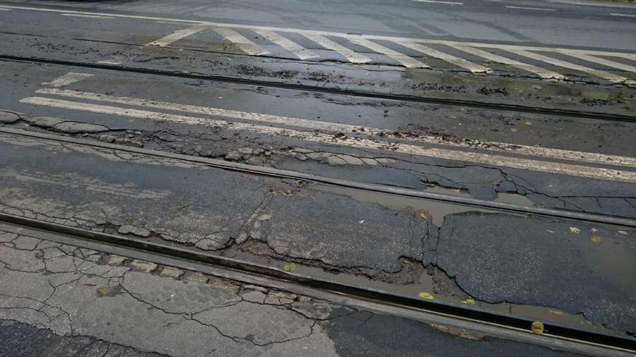 Gdyby nawet najlepszy materiał wylali to i tak będzie odskakiwał, powód to stary, wymyty podkład torowiska, które przy przejeździe tramwaju pływa jak galareta i wybija, wybije każdy wylany materiał, chyba że będą to płyty betonowe między i obok szyn jak to jest naprzykład we wspomnianej Łodzi,…ale aby cokolwiek zrobić potrzebna jest zgoda i kasa wszechwładnych władz z Łodzi + współfinansowanie tej inwestycji, bo z tego co się orientuje to ulica jest wojewódzka….