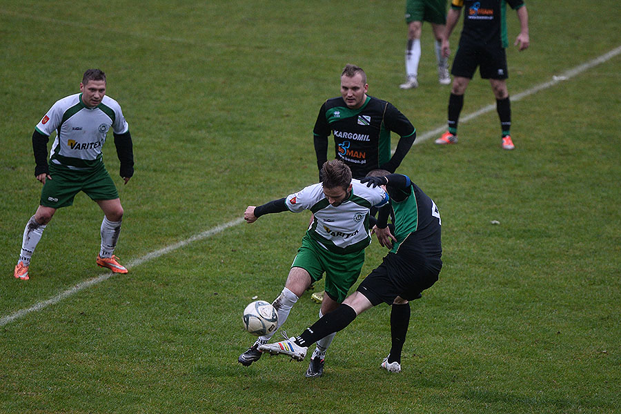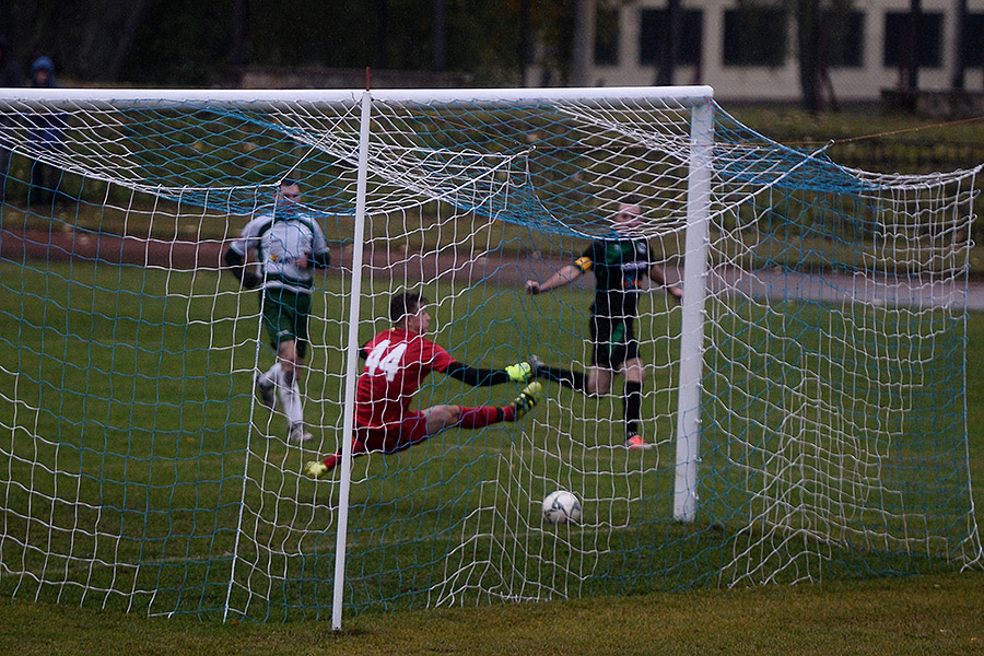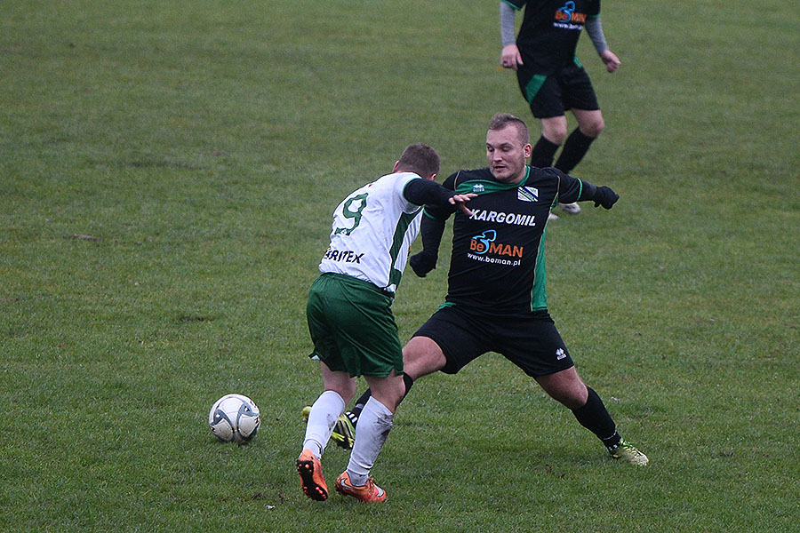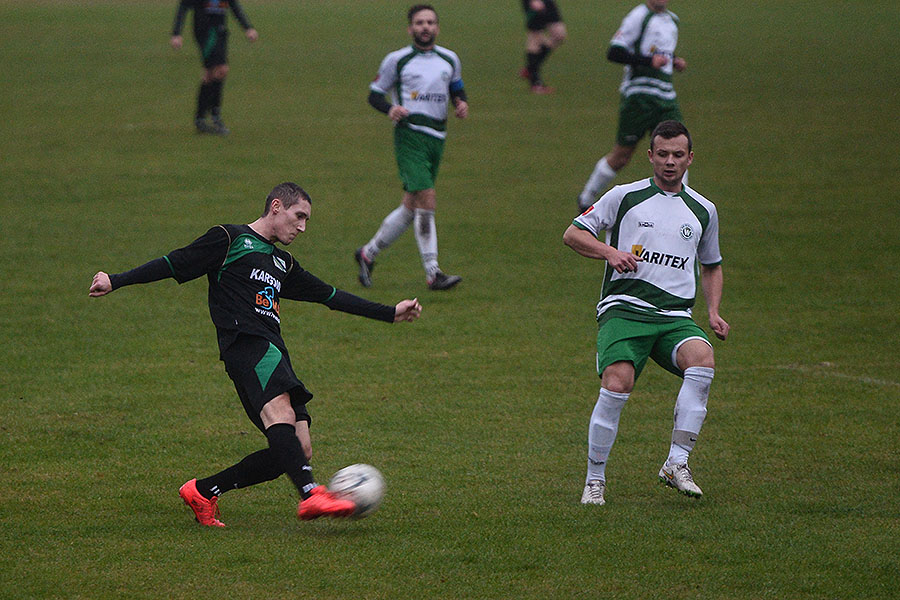 Pierwsza odsłona meczu to testowanie mokrej murawy i możliwości przeciwnika. Jedynym mocnym akcentem była poprzeczka w wykonaniu jednego z naszych graczy. Oprócz tego piłkarze obu drużyn razili nieskutecznością, podawali niedokładnie, za plecy. Większość piłkarzy, a na pewno Błażej Bujalski woleliby o tych 45 minutach zapomnieć.