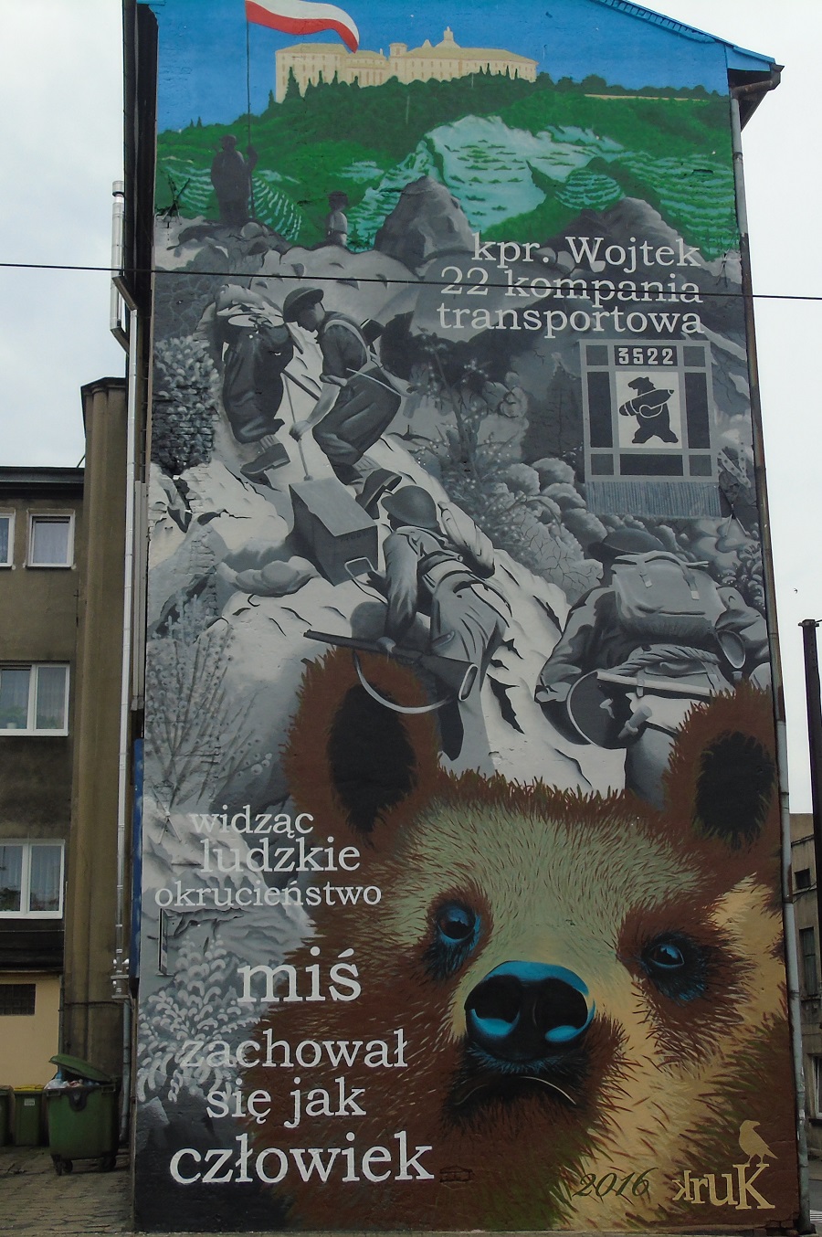 Rusztowanie rozebrano wczoraj (11 lipca) pozostawiając jedynie jego najniższe partie. Dziś nic nie blokuje dostępu do pełnego obrazu 15-metrowego muralu. Składa się on z trzech części. Najwyższa przedstawia Monte Cassino przed rozpoczęciem bitwy, na drugiej widzimy żołnierzy zatykających flagę na ruinach twierdzy, a na trzecim przygotowania do bitwy, na tej właśnie widnieje wizerunek misia. Na ścianie znalazł się również cytat z „Piosenki o Wojtku”, którą wykonują Marika & Maleo Reggae Rockers.