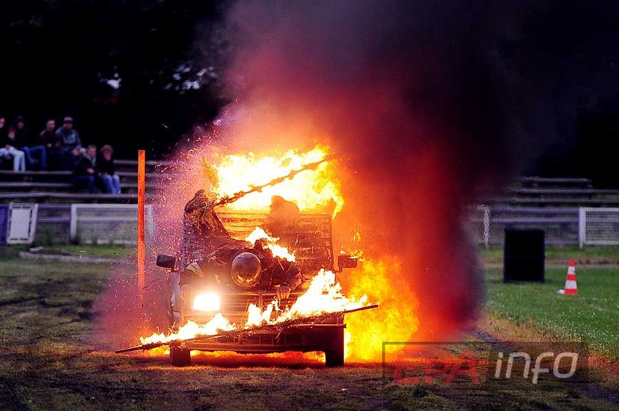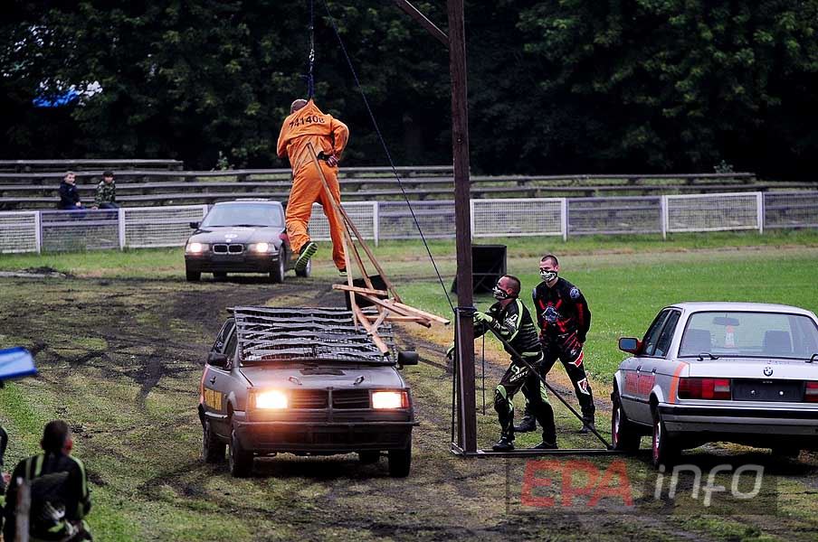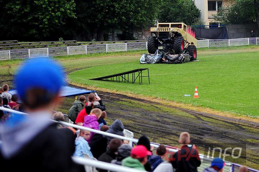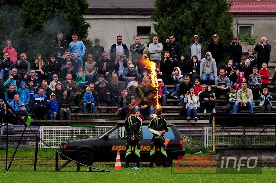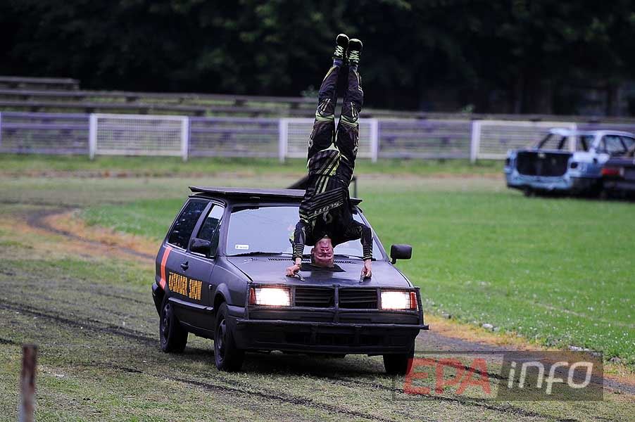 Grupa kaskaderów specjalizująca się w trikach filmowych i reklamowych dała dziś popis na stadionie przy ul. Sempołowskiej. Najwięcej emocji wzbudziły skoki przez płonące obręcze i Globus Śmierci. Podczas tego drugiego pokazu motocyklista jeżdżący w okrągłej klatce zaliczył upadek. Wcześniej na bok wywróciło sie BMW jadące na dwóch kołach. W środku były dwie kobiety z publiczności. Odważnym paniom nic się jednak nie stało i wyszły z auta uśmiechnięte. Pokazy trwały ponad godzinę.