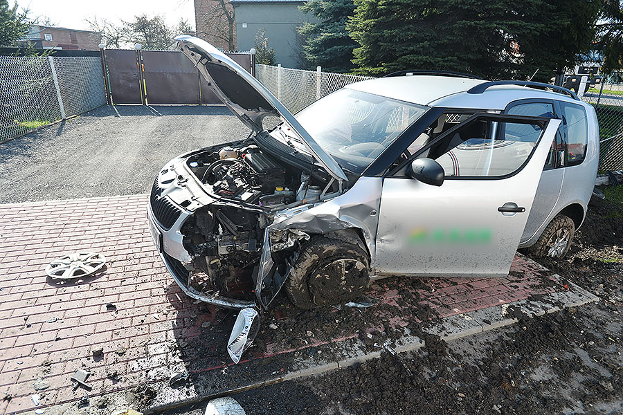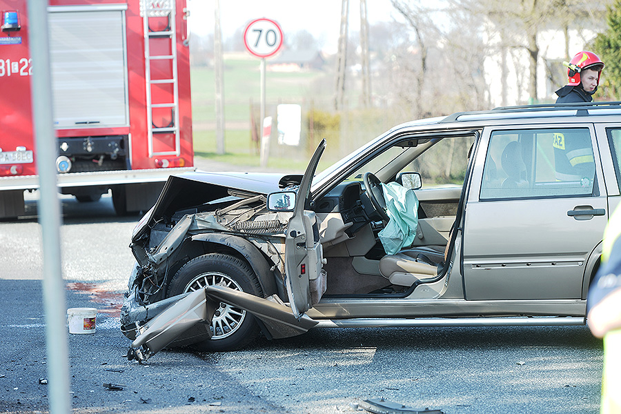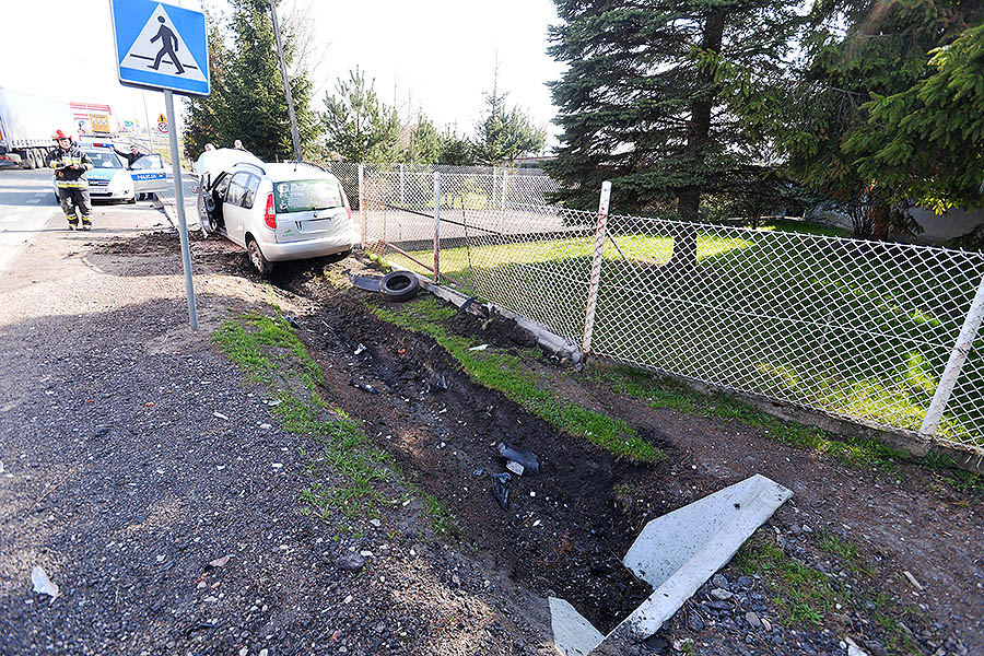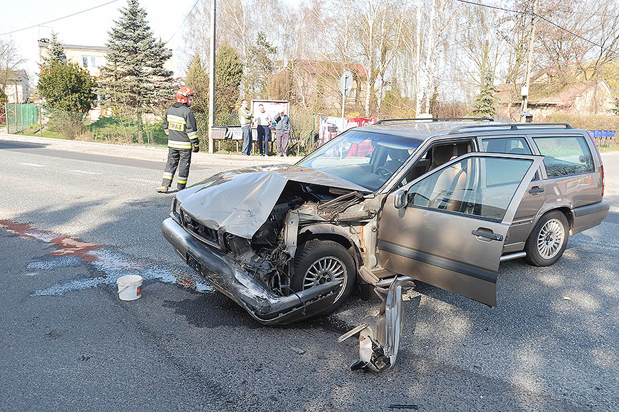 Około godz. 15.30 mężczyzna jadący Volvo V70 od strony Pabianic, na wysokości sklepu w Szynkielewie (zaraz za rondem) chciał skręcić w lewo. Wykonując manewr nie ustąpił pierwszeństwa jadącej z naprzeciwka Skodzie Roomster i doszło do czołowego zderzenia. Skoda przeleciała przez rów i urwała koło. Okazało się, że uczestnikom zdarzenia nic nie jest. Sprawca przeprosił poszkodowanego za swoją nieuwagę. Obaj kierujący byli trzeźwi. Strażacy zepchnęli rozbite Volvo na pobocze.