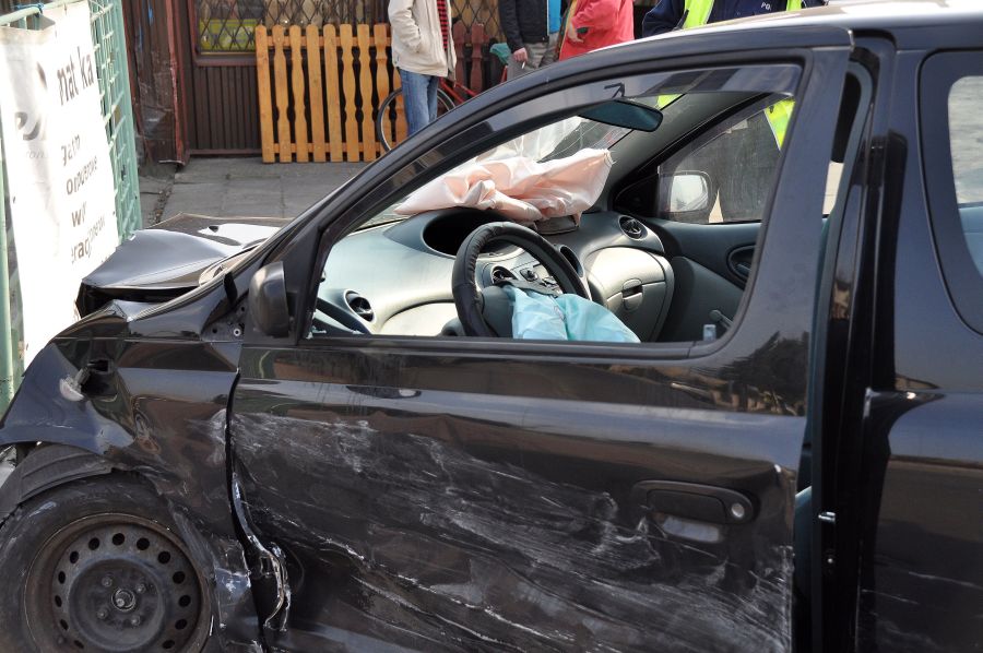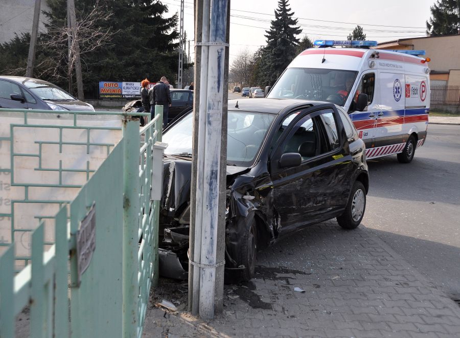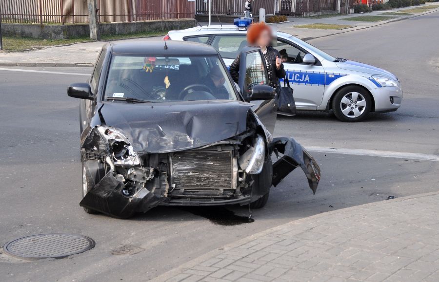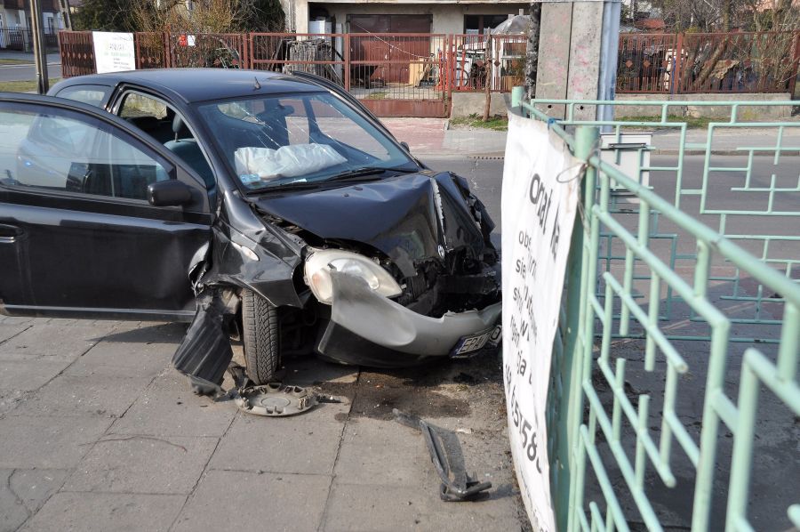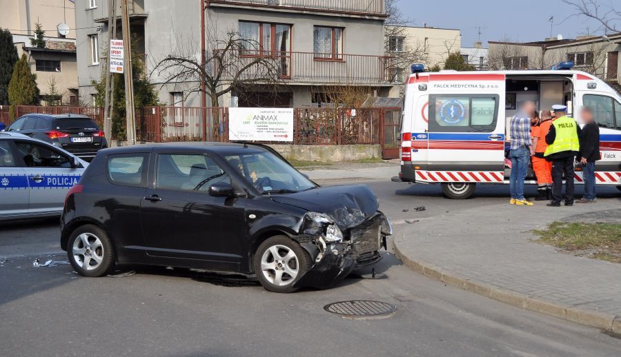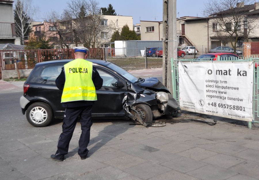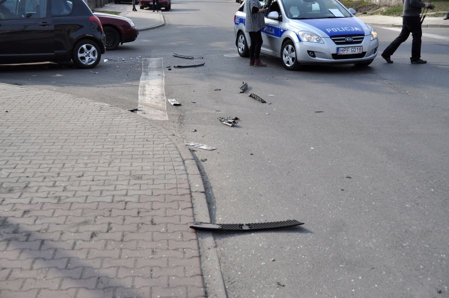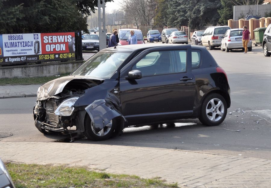Suzuki Swift na bytomskiej rejestracji jechało ulicą Dobrą od ulicy Warszawskiej. Kierujący samochodem mężczyzna nie zatrzymał się przed znakiem STOP i wjechał na skrzyżowanie uderzając w jadącą ulicą Piotra Skargi Toyotę Yaris na pabianickiej rejestracji. W wyniku uderzenia kierująca Toyotą uderzyła w zaparkowanego Nissana i wjechała w pobliską betonową latarnię.