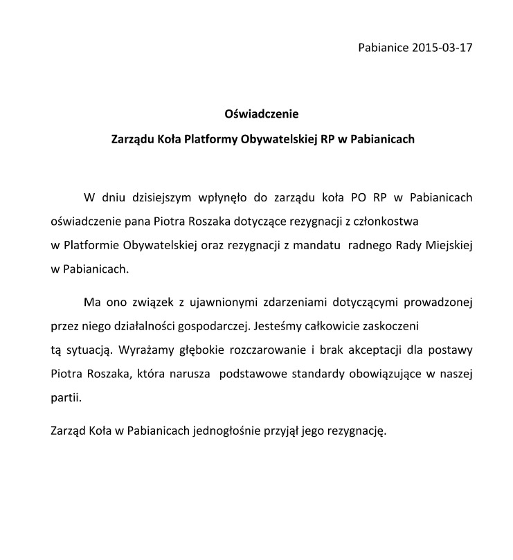 Roszak pismo o rezygnacji złożył na ręce Krzysztofa Habury, szefa PO w Pabianicach. Jak dowiedział się również portal EPAinfo, Roszak odda mandat radnego miejskiego. Jeszcze dziś ma zostać wysłane oświadczenie w tej sprawie.