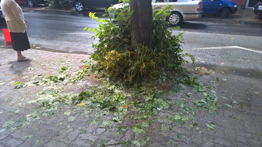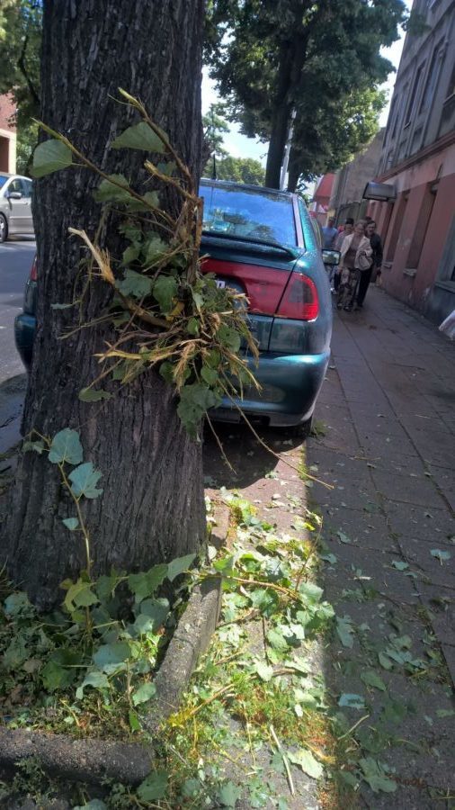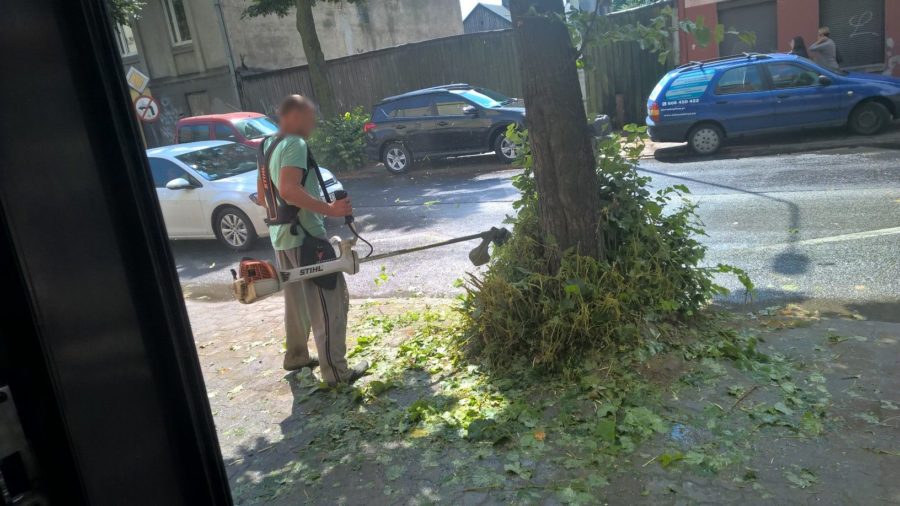 Według jego relacji, mężczyzna zajmujący się wycinką trawy, nie stosował się do żadnych przepisów BHP i dość beztrosko wymachiwał swoim narzędziem pracy, przechodząc między ludźmi. Gałązki i kamienie, które napotkała kosa spalinowa, zamiast bezpiecznie na chodniku, lądowały na zaparkowanych pod drzewami samochodach, a nawet wewnątrz pobliskich sklepów. Ofiarą koszenia padły również pobliskie ogródki.