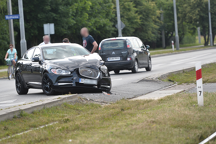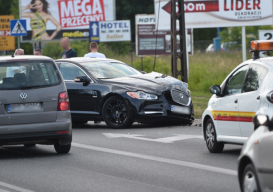 Jaguar został dość mocno rozbity. Auto stoi na drodze i blokuje jeden pas ruchu. Kierowca czeka na lawetę. Tramwaj może mieć kilkunastominutowe opóźnienie.