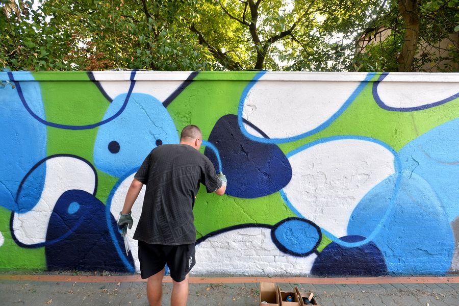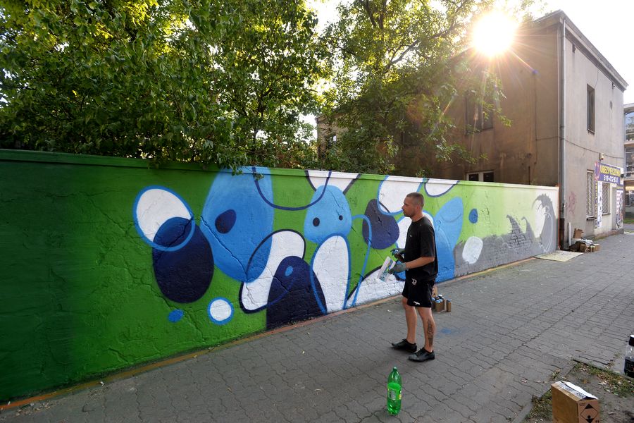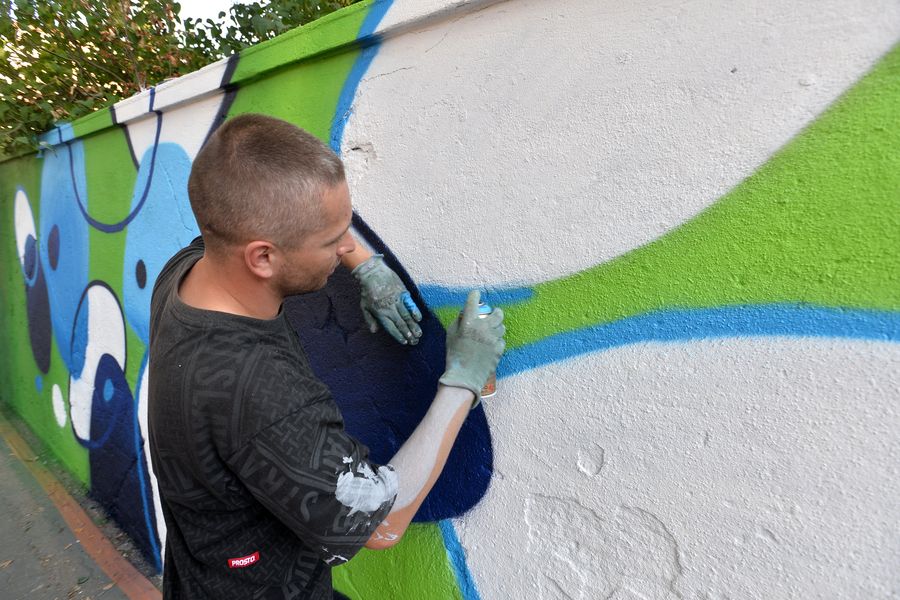 Adam Wirski maluje dziś kolejną ścianę. Motywem przewodnim jest woda.