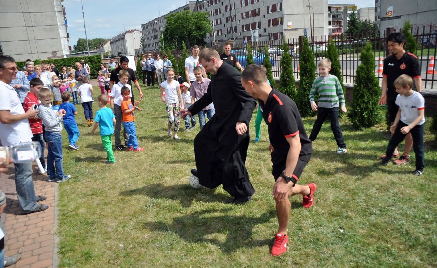 Piłkarze Widzewa grali w piłkę z dziećmi na terenie parafii Trójcy Przenajświętszej w Pabianicach. Do gry włączył się także tamtejszy ksiądz wikariusz.