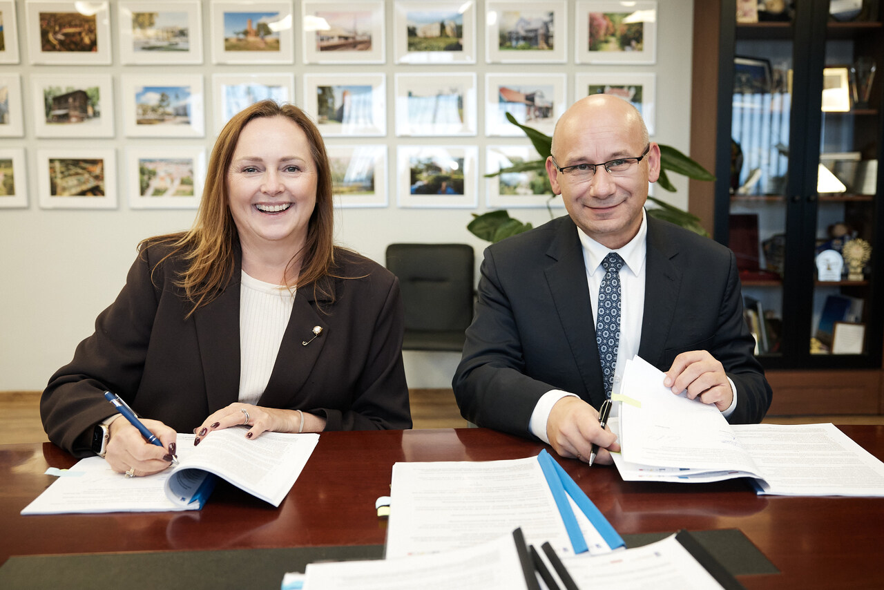Joanna Skrzydlewska, marszałek województwa łódzkiego, i Marcin Witko, prezydent Tomaszowa Mazowieckiego podpisali umowy na dofinansowanie kluczowych dla tego miasta inwestycji.