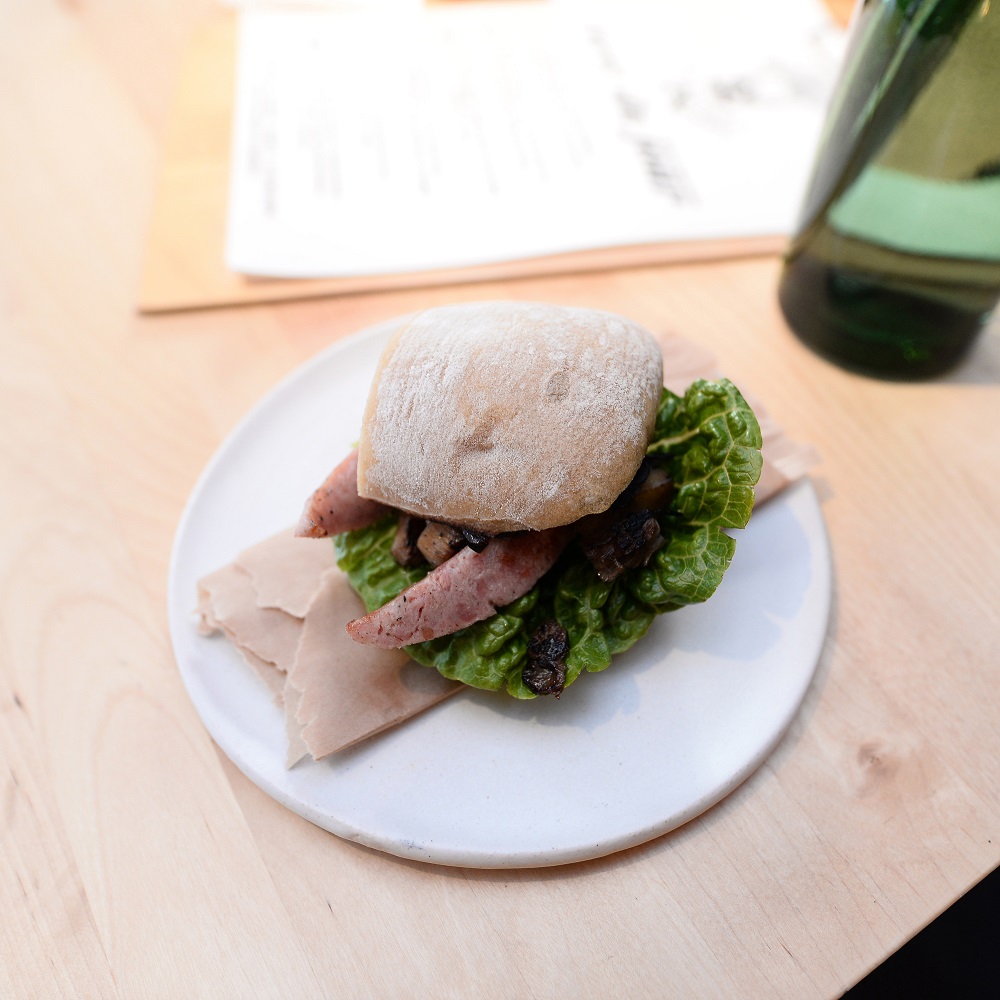 1. Ciabatta z grillowaną białą kiełbasą, Chrupka sałata, Boczniak, Sos chrzanowy