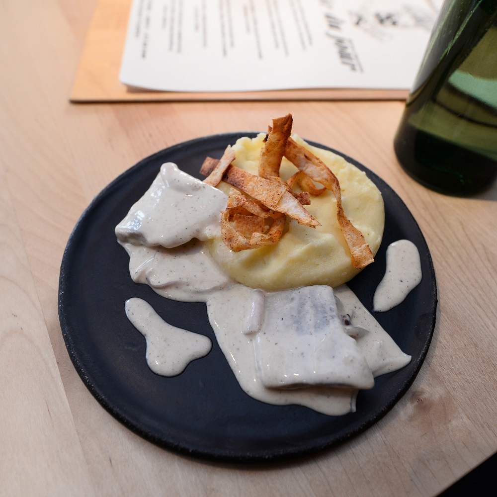 6. Śledź w zalewie śmietanowo-majonezowej z czerwoną cebulą i gałką muszkatołową na puree truflowym.