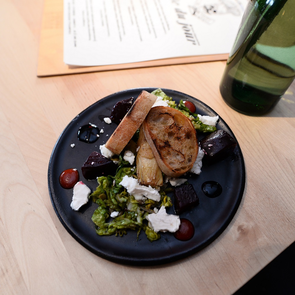 4. Burak pieczony, Karczoch pieczony, Ser kozi, Chrupka sałata, Balsamico, Grzanka