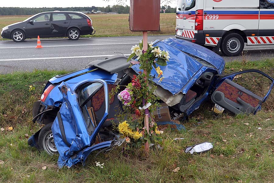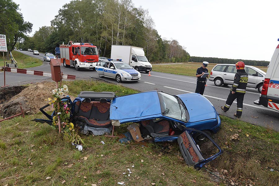 Pasażerka z Nissana z urazem klatki piersiowej i wstrząsem mózgu została zabrana do pabianickiego szpitala. Auto, którym podróżowała, pękło na pół.