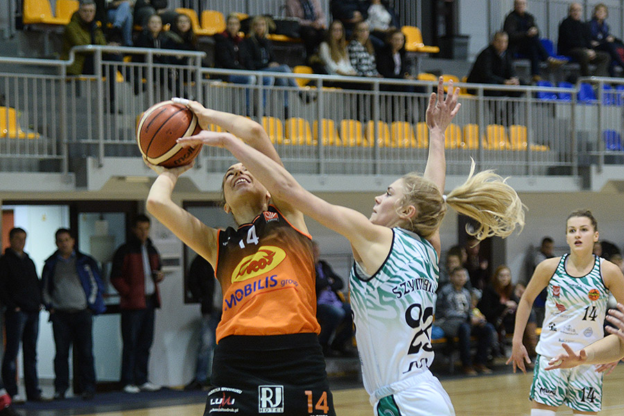 Lepiej zaczęły przyjezdne. Pabianiczanki ocknęły się dopiero w 7. minucie przy stanie 3:10 i zaczęły odrabiać straty. Robiły to na tyle skutecznie, że pierwsza kwarta zakończyła się 5-punktowym prowadzeniem, a w 15. minucie Grot Mobilis prowadził już 30:20. Zdobytego wtedy prowadzenia nie oddały już do samego końca, choć pierwsza połowa zakończyła się niewielką przewagę 34:32. Najskuteczniejsze w naszej ekipie były Kinga Dzierbicka (19), Anna Kolasa (10) i Anna Kudelska (10).