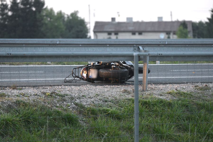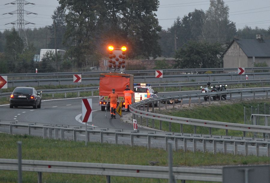Motocyklista i pasażerka zostali ranni, po tym jak jednoślad przewrócił się na zakręcie, nieopodal wiaduktu kolejowego w Szynkielewie III. Kierujący motocyklem (zgierskie rejestracje) wypadł poza drogę, przelatując przez bariery energochłonne. Jechał w stronę Łodzi. Poszkodowani zostali zabrani do szpitala.