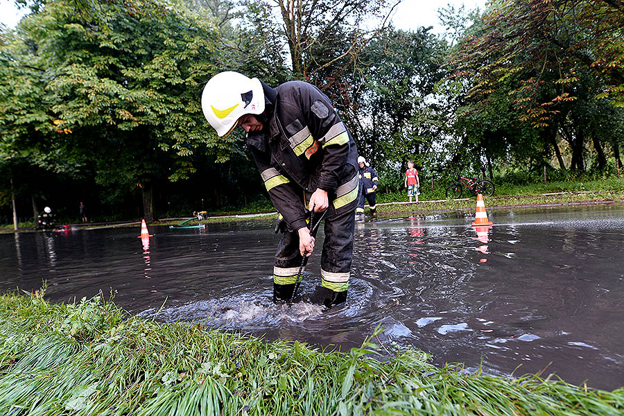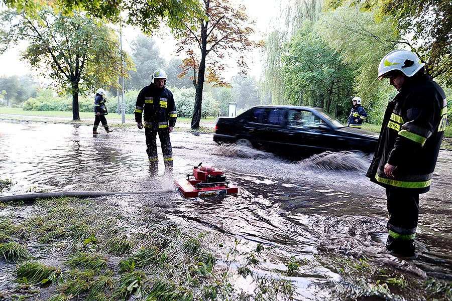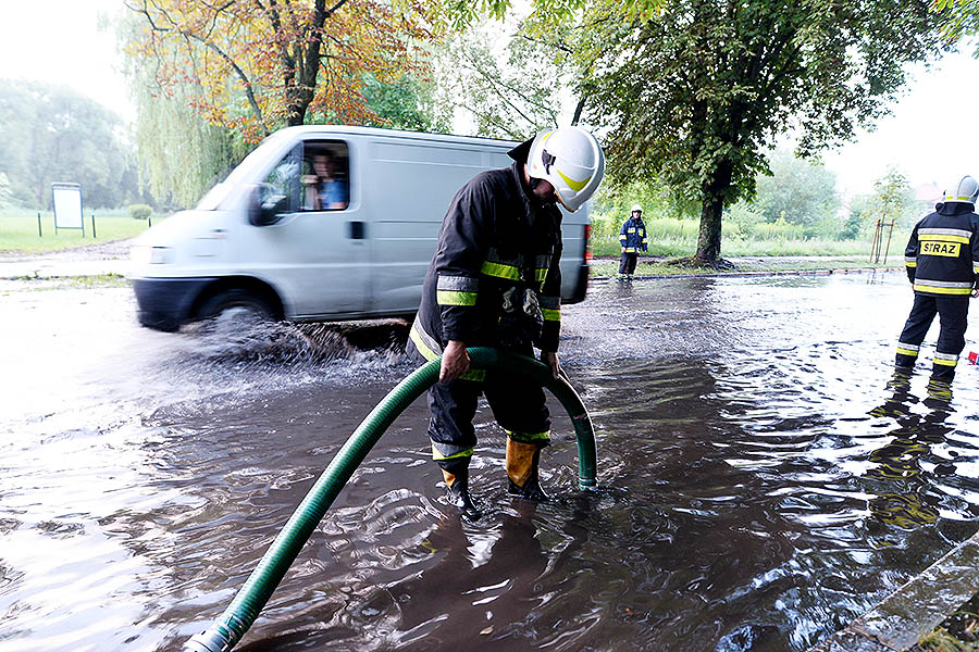 Strażacy musieli odpompowywać wodę, która zalała w środę ulicę Grota Roweckiego.