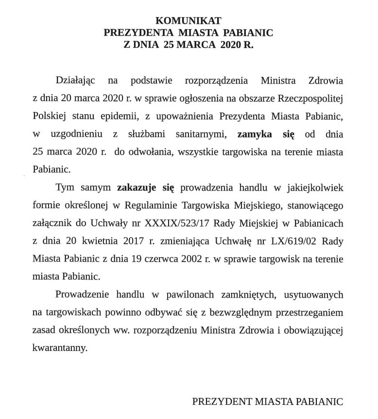 „Prowadzenie handlu w pawilonach zamkniętych, usytuowanych na targowiskach powinno odbywać się z bezwzględnym przestrzeganiem zasad określonych w rozporządzeniu Ministra Zdrowia i obowiązującej kwarantanny”.