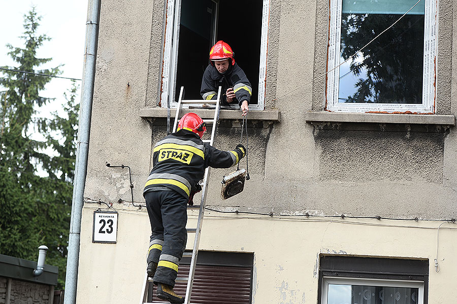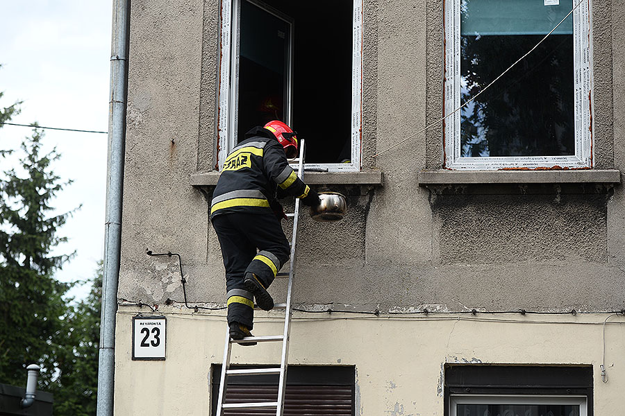 Czujni sąsiedzi wezwali strażaków, którzy w sile trzech zastępów popędzili do zadymionego mieszkania. Do środka weszli przez okna po przystawionej do budynku drabinie. Okazało się, że płonie garnek z potrawą. Płonący obiad został wyniesiony na zewnątrz budynku i ugaszony wodą z hydronetki. Spaleniu uległa też kuchenka elektryczna. Akcja trwała kilkanaście minut.