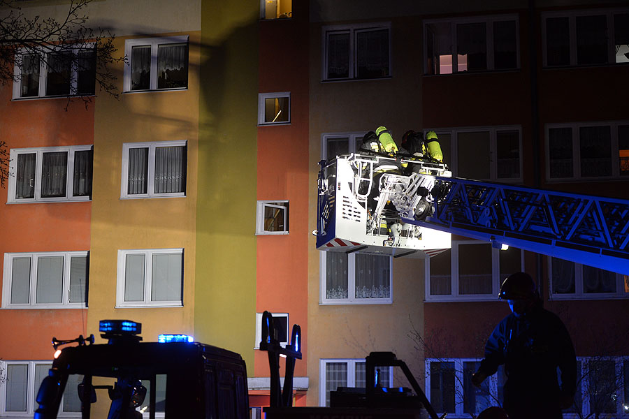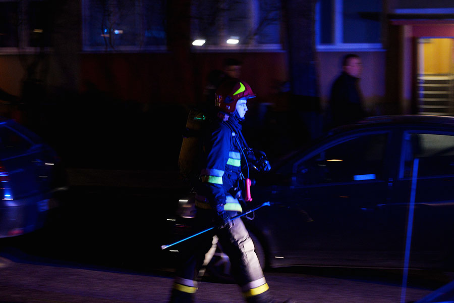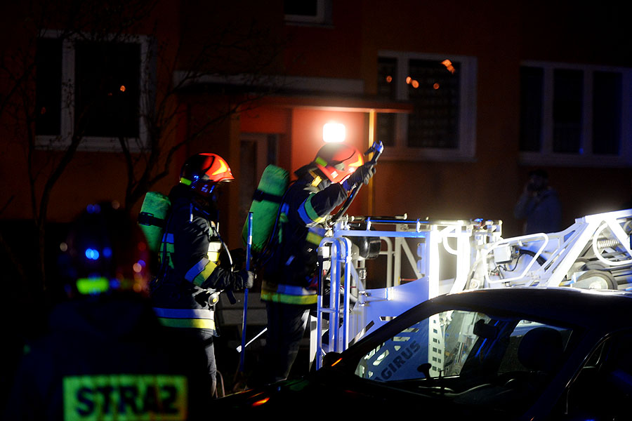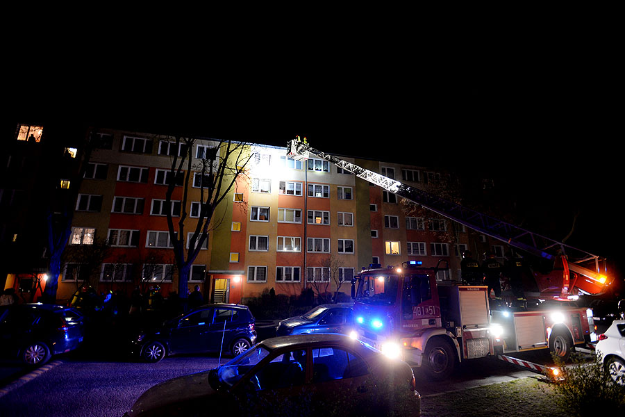 Mieszkańcy bloku wyczuli dym na klatce schodowej. Ktoś zadzwonił po straż pożarną. Na miejsce przyjechały 4 zastępy w tym drabina mechaniczna. Strażacy nie mogli zlokalizować lokalu, z którego wydobywał się dym. Z kosza drabiny obserwowali pomieszczenia na wyższych piętrach. Dopiero po chwili z mieszkania, gdzie pojawił się ogień wyszła starsza kobieta. Wcześniej z bloku ewakuowały się 3 osoby.