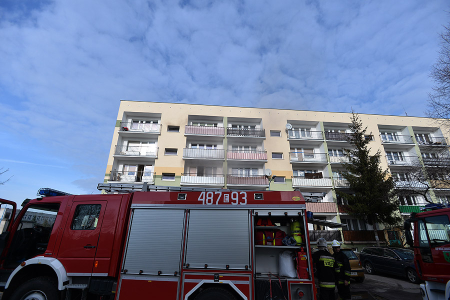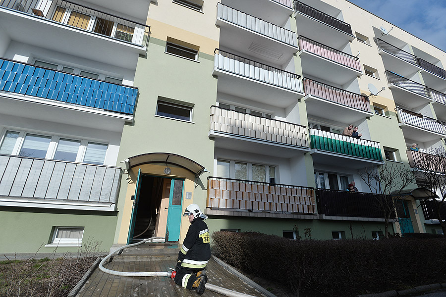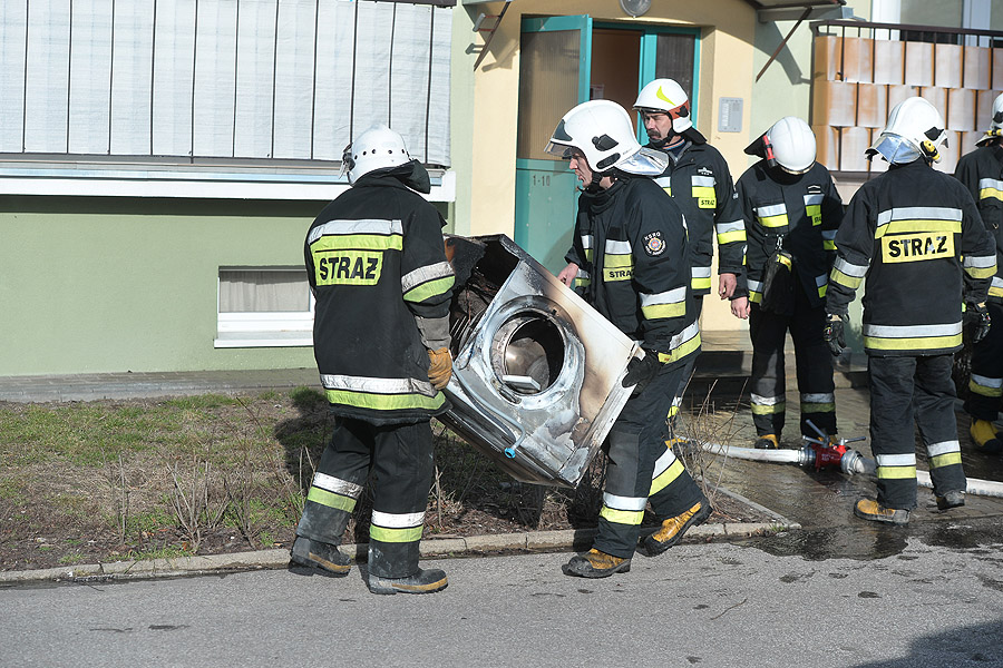Do zdarzenia doszło chwilę przed godz. 13.00. W jednym z mieszkań na drugim piętrze, w łazience wybuchł pożar. Źródłem ognia okazała się pralka. Zadymienie było tak ogromne, że kłęby czarnego dymu wydobywały się oknami mieszkania. Strażacy udzielili lokatorce mieszkania wsparcia psychicznego i bezpiecznie wyprowadzili z bloku.
