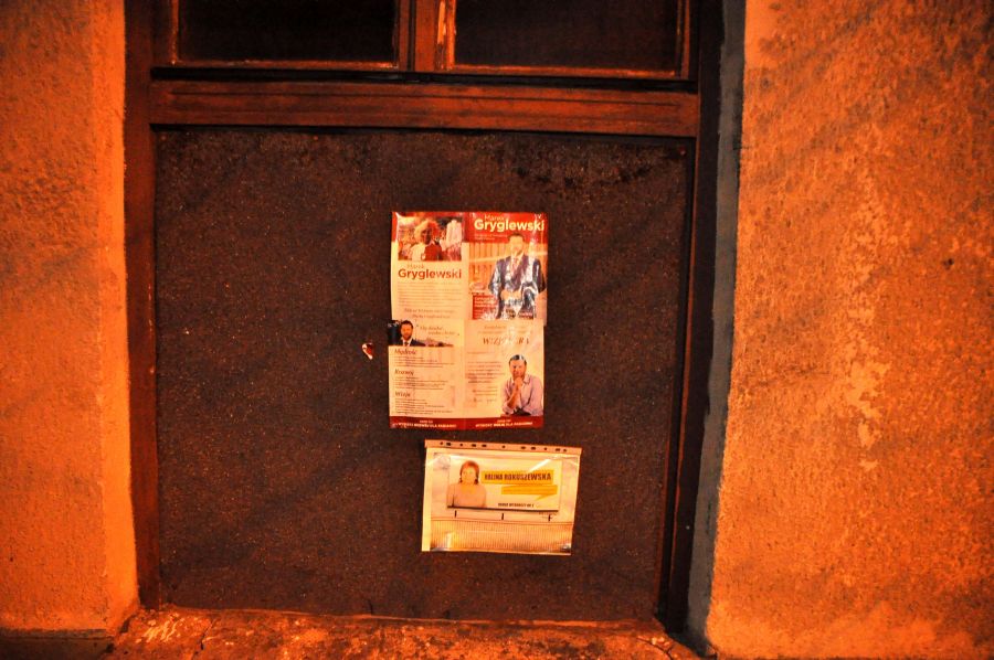 Na kamienicy przy ul. Traugutta 43 wciąż wiszą plakaty wyborcze kandydata na prezydenta z SLD, który ostatecznie został radnym powiatowym – Marka Gryglewskiego. Na tym samym budynku wisi także ulotka kandydatki na radną powiatową okręgu nr 3 z tej samej partii – Haliny Rokuszewskiej.