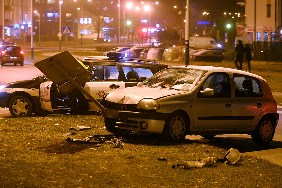 Około 50-letni mężczyzna jechał Renault Clio ulicą 20 Stycznia od Smugowej. Jak zeznał policjantom, przed skrzyżowaniem z ul. Grota Roweckiego zobaczył jadące ul. 20 Stycznia (od Nawrockiego) czarne Audi. Zaczął gwałtownie hamować, bo kierujący Audi nie zamierzał ustąpić pierwszeństwa. Podczas hamowania stracił panowanie nad pojazdem i zjechał na pobocze uderzając w znak informujący o przejściu dla pieszych i kontroli fotoradarowej.