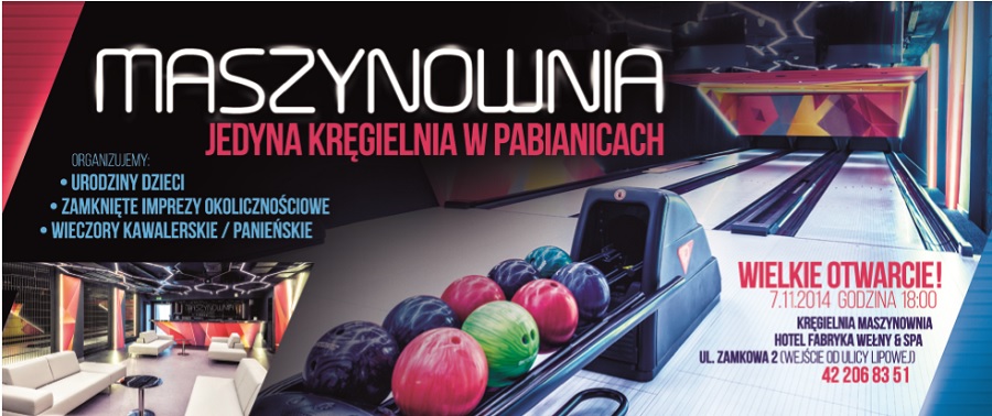 Wielkie otwarcie kręgielni odbędzie się w piątek 7.11.2014 o godzinie 18:00. Dla gości bezpłatny parking. Kręgielnia Maszynownia w Hotelu Fabryka Wełny & SPA, ul. Zamkowa 2 (wejście od ulicy Lipowej), nr telefonu 42 206 83 51.