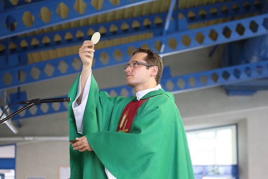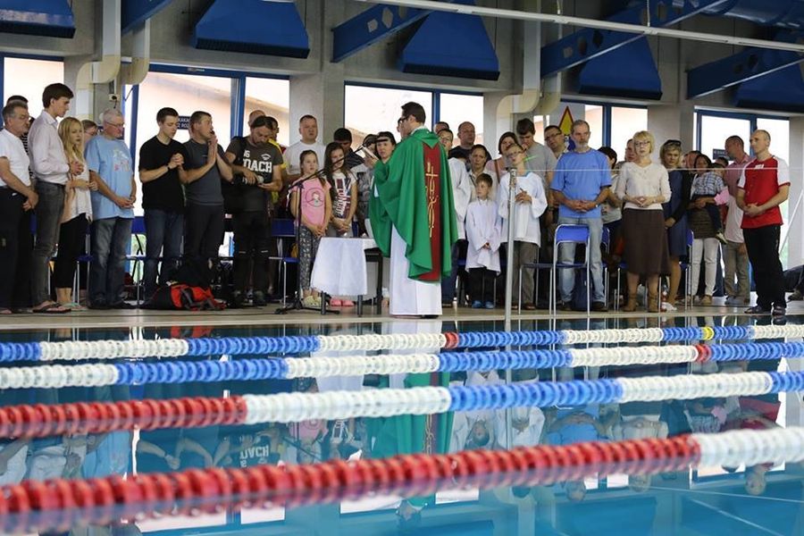 Zanim pielgrzymi wskoczyli do wody ksiądz Michał Misiak, pomysłodawca wodnej pielgrzymki, odprawił mszę św. na basenie Miejskiego Ośrodka Sportu i Rekreacji. – Płyńcie w pokoju Chrystusa – powiedział na zakończenia wikary z parafii św. Mateusza.