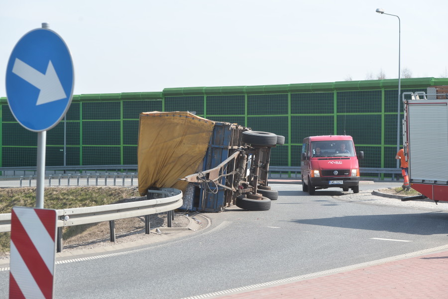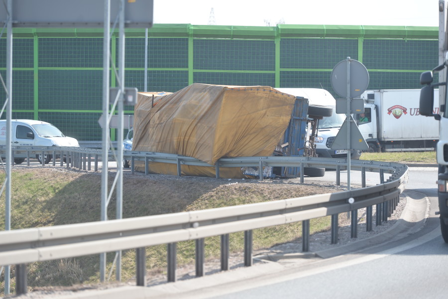 Na rondzie przed wiaduktem przy ul. Lutomierskiej, przyczepa przewróciła się na balustradę. Ruch w tym miejscu jest znacznie utrudniony.