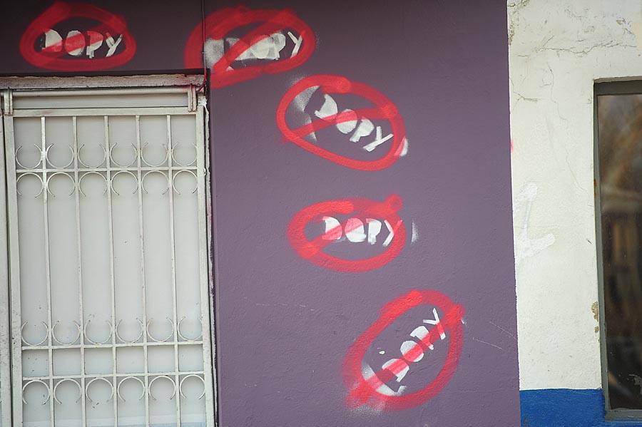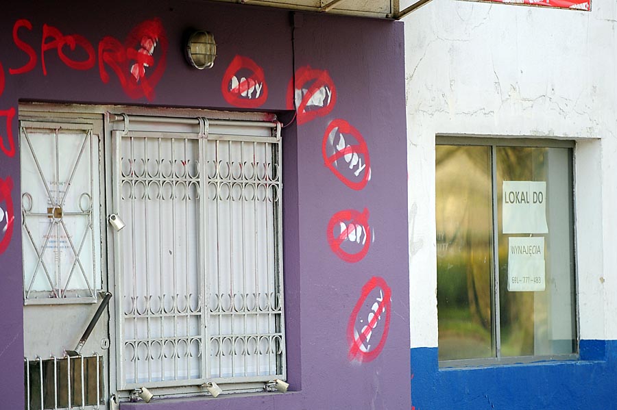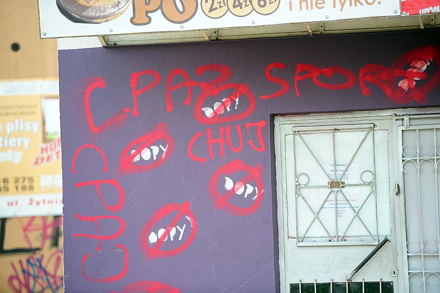 Nieznani sprawcy zostawili wielkie napisy „Cpaj sport”. W przekreślonym kółku są też napisy „reklamowe” DOPY. Za zniszczenie mienia grozi kara od 3 miesięcy do 5 lat pozbawienia wolności.